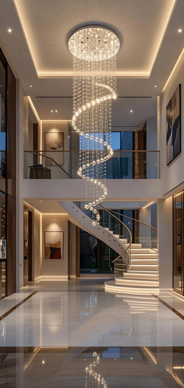 This 9-light statement chandelier has a sparkling spiral shape that looks just right in a circular stairwell. Its glittering crystals hang in tiers from stainless steel cables and a circular canopy. The canopy has a polished chrome finish. At 9 feet tall, this chandelier is a dramatic focal point, even in larger spaces.